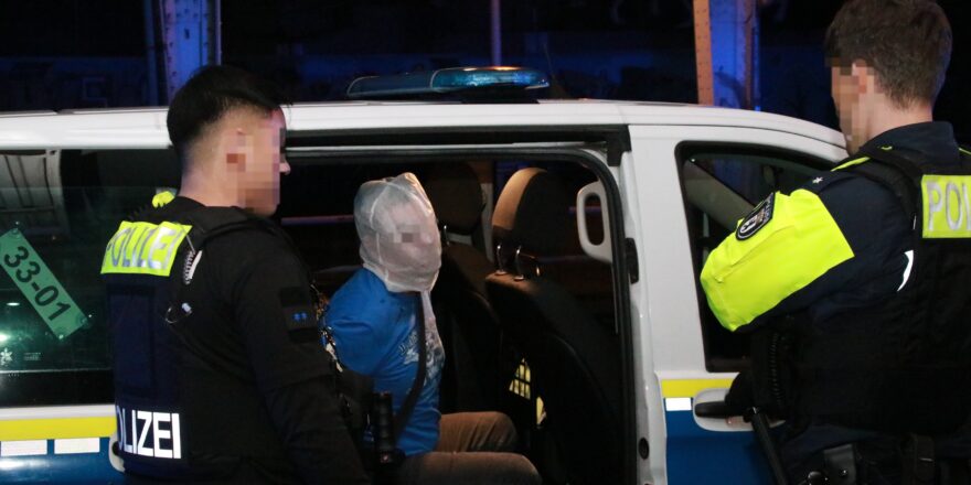 Auch im Funkwagen der Landespolizei beruhigte sich der Mann nicht. Er trat gegen die Einrichtung, schlug wiederholt seinen Kopf gegen die Seitenscheibe und spuckte in Richtung der Polizistinnen und Polizisten. Eine Beamtin setzte ihm schließlich eine Spuckschutzhaube auf, während andere seine Beine fixierten. Durch die heftigen Kopfstöße, durch sich selbst, verletzte sich der Mann an der Nase.