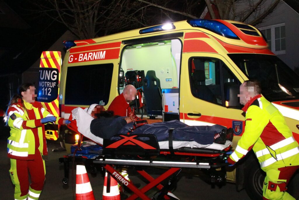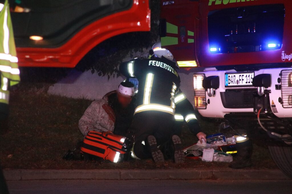 Ein mutmaßlicher Tatverdächtiger wurde schwer kopfverletzt und blutüberströmt am Einsatzort gefunden. Rettungskräfte, darunter die Freiwillige Feuerwehr Blumberg, versorgten ihn und brachten ihn mit Notarztbegleitung ins Krankenhaus.