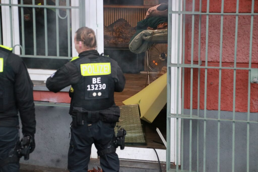 Der mutmaßliche Täter wurde in einem nahegelegenen Lokal vermutet. Aus diesem Grund verschafften sich die Einsatzkräfte gewaltsam Zugang zu der Lokalität und öffneten die Tür mit einer Ramme. Dabei wurde das Glas der Eingangstür zerstört und fiel in die Innenräume.