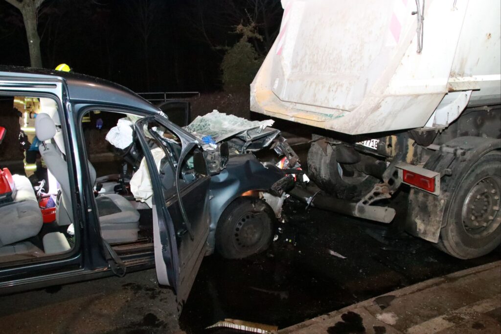 Aus bislang ungeklärter Ursache übersah sie offenbar einen am Fahrbahnrand stehenden LKW und prallte mit ihrem Fahrzeug in das Heck des Sattelaufliegers. Durch die Wucht des Aufpralls wurde die Front des Pkw massiv deformiert, zudem schob sich das Fahrzeug unter den Auflieger.