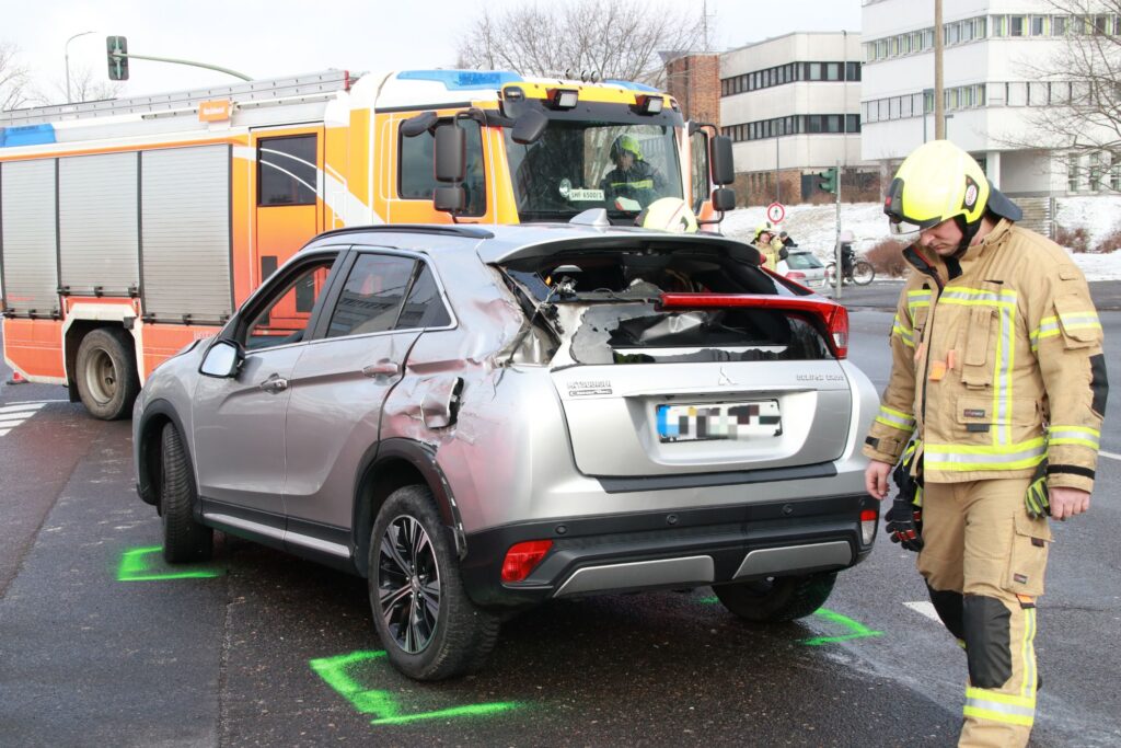 Nach ersten Informationen fuhr der Fahrer eines Mitsubishi an einer Ampel zunächst auf einen Kastenwagen auf und kollidierte kurz darauf zusätzlich mit einem Feuerwehrfahrzeug.