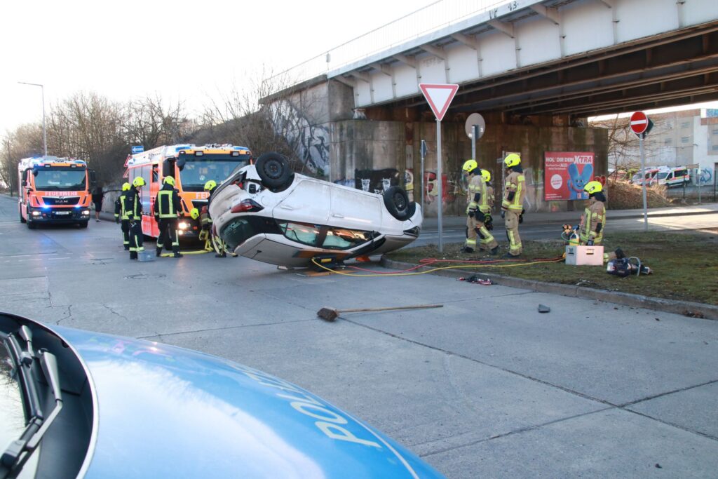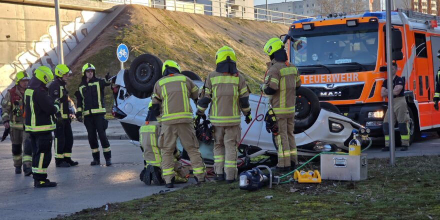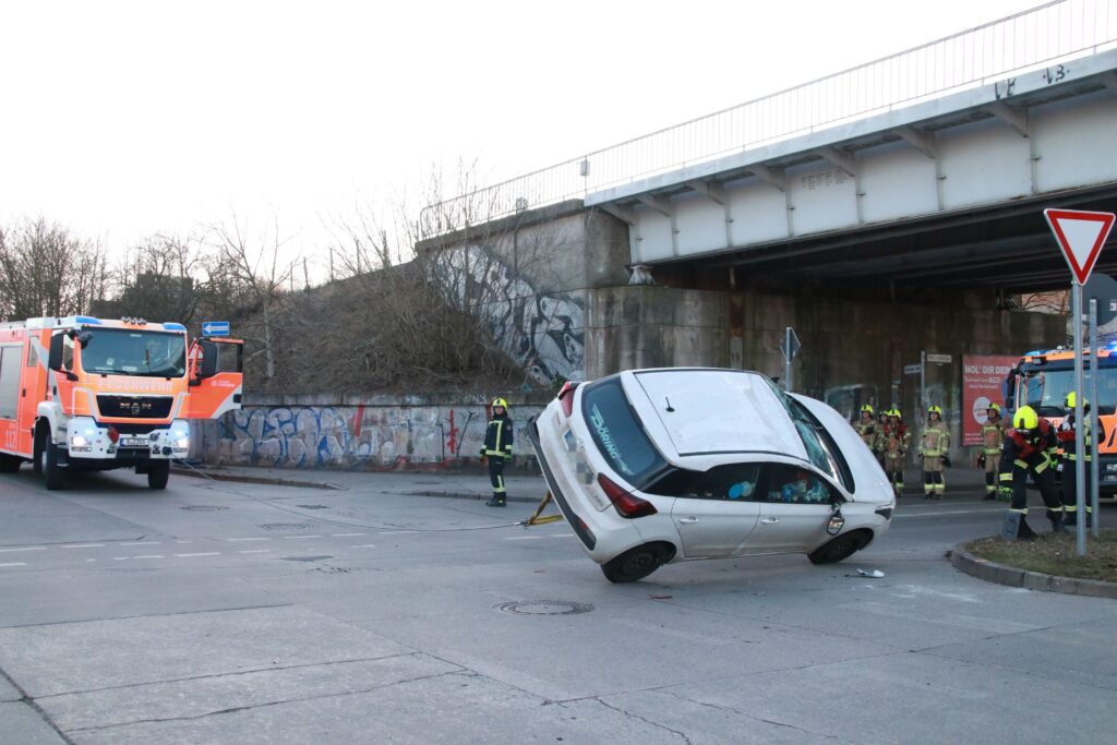 Durch die Wucht des Aufpralls überschlug sich der Hyundai und blieb auf dem Dach liegen. Ersthelfer kümmerten sich bis zum Eintreffen der Rettungskräfte um die Beteiligten.