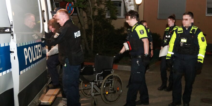 Noch in der Wohnung nahmen Polizeikräfte den mutmaßlichen Täter fest. Für den Abtransport wurde ein Gefangenentransporter angefordert, der den Mann in eine Gefangenensammelstelle brachte. Der 51-Jährige befand sich bei seiner Festnahme in einem Rollstuhl und musste von den Einsatzkräften in das Fahrzeug gehoben werden.